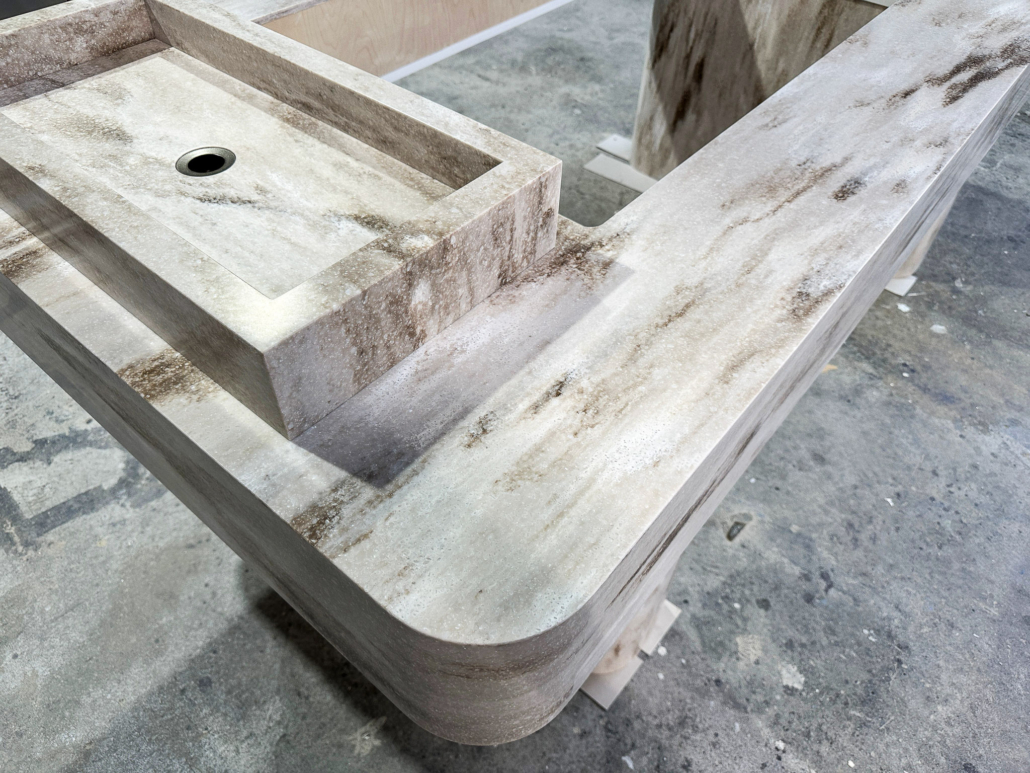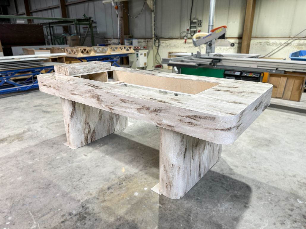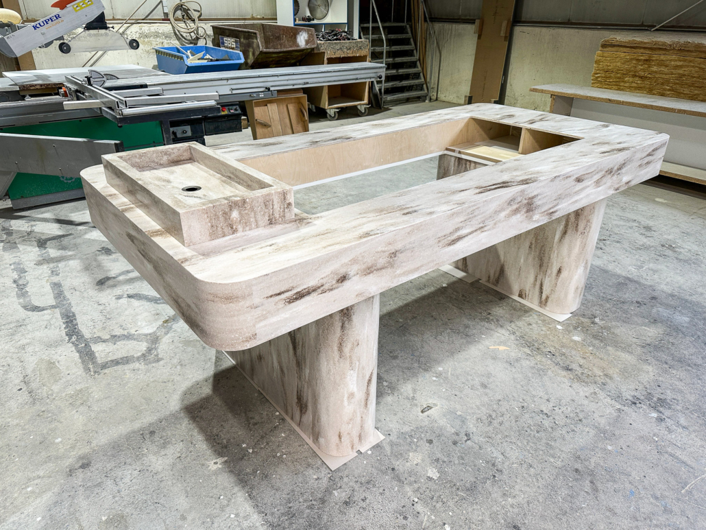 - Tischplatte: Gefertigt aus edlem Corian® Sandalwood in den Maßen ca. 2600 x 1200 mm. Die Ecken wurden durch präzise thermische Verformung mit einem Radius von 100 mm gestaltet – für eine weiche, fließende Linienführung. Die umlaufende Abkantung von 200 mm sorgt für Stabilität und einen markanten Auftritt. Unterseitig mit weißem Holzwerkstoff geschlossen, mit einer großzügigen Öffnung für eine flexible Nutzung.