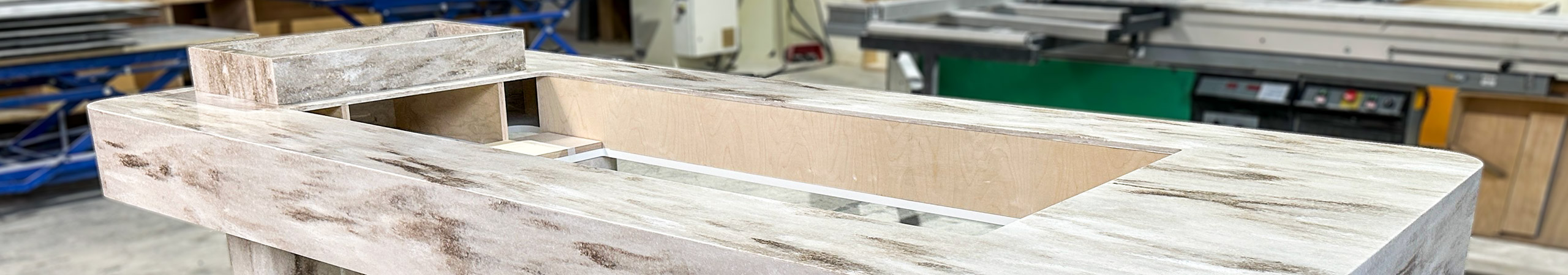 - Stollen: Zwei stabile Seitenelemente aus Corian® Sandalwood, ebenfalls mit abgerundeten Kanten, geben dem Display einen soliden Stand und eine hochwertige Anmutung.